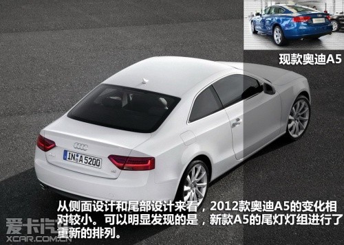 2012款?yuàn)W迪A5屬于中期改款車(chē)型,在外觀、內(nèi)飾、動(dòng)力和底盤(pán)上都有較為明顯的變化。依據(jù)之前的消息,新款車(chē)型將于今年9月在海外開(kāi)始接受預(yù)定。近日,2012款?yuàn)W迪A5在國(guó)內(nèi)的測(cè)試諜照也被首次曝光,預(yù)計(jì)新車(chē)不久就將引入國(guó)內(nèi)市場(chǎng)。(諜照來(lái)源:騰訊汽車(chē))