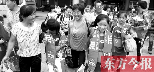 昨天下午3點(diǎn),在新鄭國(guó)際機(jī)場(chǎng)大廳等待已久的隊(duì)員家長(zhǎng)們,終于迎來(lái)臨潁縣女子足球隊(duì)的小隊(duì)員們。當(dāng)家長(zhǎng)們看見(jiàn)隊(duì)員從大廳里整齊走出來(lái),都圍了上去,紛紛念叨著“瘦了,黑了”。李女士說(shuō),大約有7名小隊(duì)員的家長(zhǎng)來(lái)鄭州接機(jī),幾乎所有的孩子河南省都沒(méi)出過(guò)。隨后,小隊(duì)員和家長(zhǎng)們陸續(xù)坐上了趕往河南建業(yè)球場(chǎng)的大巴。