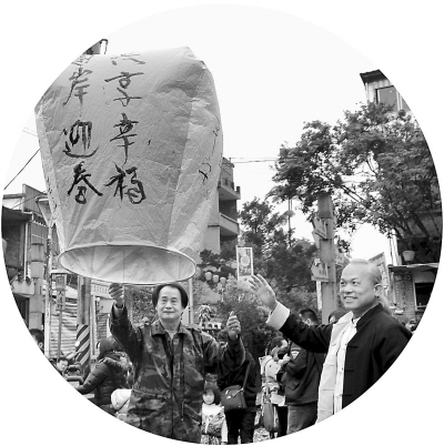 近日,臺(tái)灣毫芒雕刻家陳逢顯(右)與傳統(tǒng)天燈工藝大師林國和(左)一起放飛寫有“兩岸迎春· 共享幸?!钡奶鞜簟P卤笔衅较獏^(qū)放天燈久負(fù)盛名,已有百余年歷史。 王東明攝