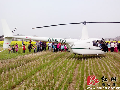 原標(biāo)題:游客駕直升機(jī)來安仁觀賞油菜花引圍觀(圖)