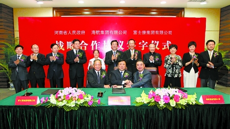 3月31日,河南省人民政府與海航集團(tuán)有限公司、富士康集團(tuán)有限公司戰(zhàn)略合作協(xié)議簽字儀式在??谂e行。省長(zhǎng)郭庚茂,海航集團(tuán)有限公司董事長(zhǎng)陳峰,富士康集團(tuán)有限公司總裁郭臺(tái)銘等出席簽字儀式。河南日?qǐng)?bào)記者 董 亮 攝