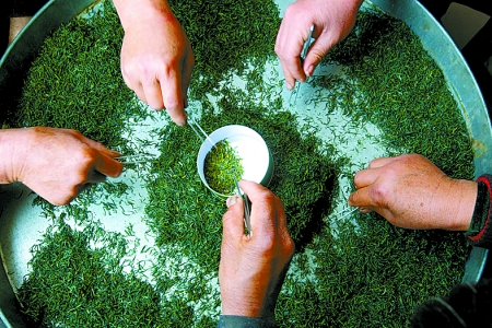 圖 浉河區(qū)白龍?zhí)洞宀柁r(nóng)把加工好的春茶分揀去雜。