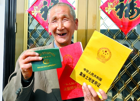 4月6日,舞鋼市尹集鎮(zhèn)張莊新型農村社區(qū)農民邱建功領到房屋所有權證和集體土地使用證后喜笑顏開。