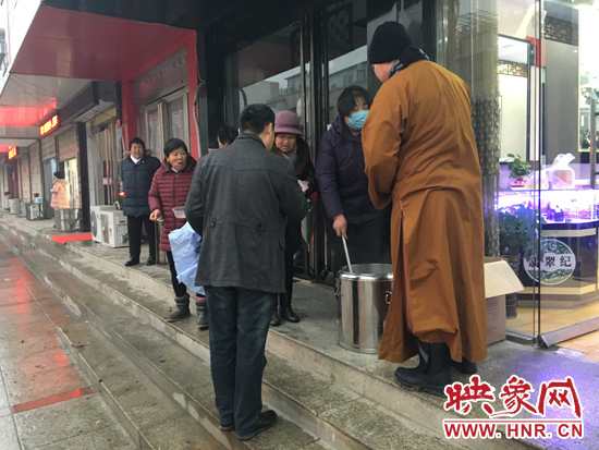 5日早上7點(diǎn)雖然下著小雨,滎陽(yáng)市康泰路于廣武路交叉口西約100米路北,一家“翡翠紀(jì)”的店門口前卻是熱鬧非凡,一名身著僧服的僧人正在給過往市民從保溫桶里盛出熱氣騰騰的臘八粥。商家老板,上學(xué)學(xué)生,環(huán)衛(wèi)工人等紛紛來到門前,端著臘八粥喝了起來。