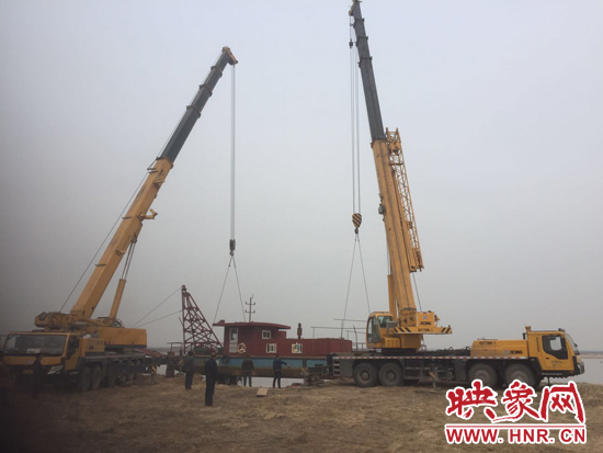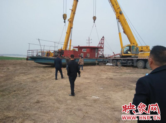 3月1日,執(zhí)法人員又來到汜水鎮(zhèn)趙村沙場岸邊,對一艘重達(dá)50噸的非法采砂船進(jìn)行起吊離上岸。