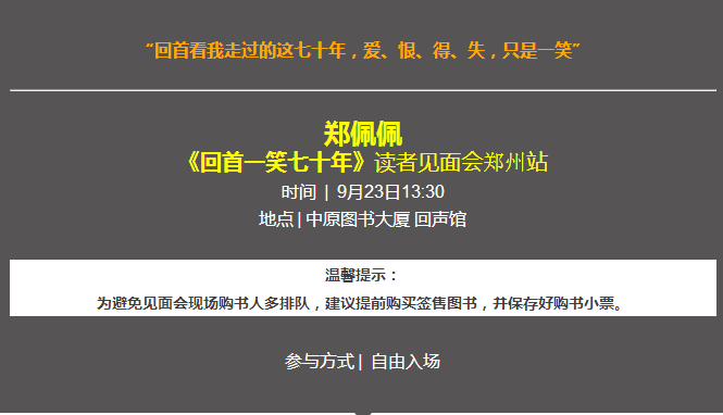 本次活動(dòng)我們選5位幸運(yùn)網(wǎng)友,將會(huì)有機(jī)會(huì)獲得前排位置,與鄭佩佩近距離接觸,并贈(zèng)送中原圖書大廈提供的小禮物。大家可以通過以下方式進(jìn)行報(bào)名。
