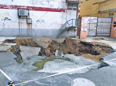 王先生說,今年7月,該處的供水管道曾爆管過一次,但當(dāng)時(shí)該處只發(fā)生一次小范圍塌陷,坑也沒這么深。沒想到,時(shí)隔2個(gè)月,該處再次管道爆裂、地面塌陷。