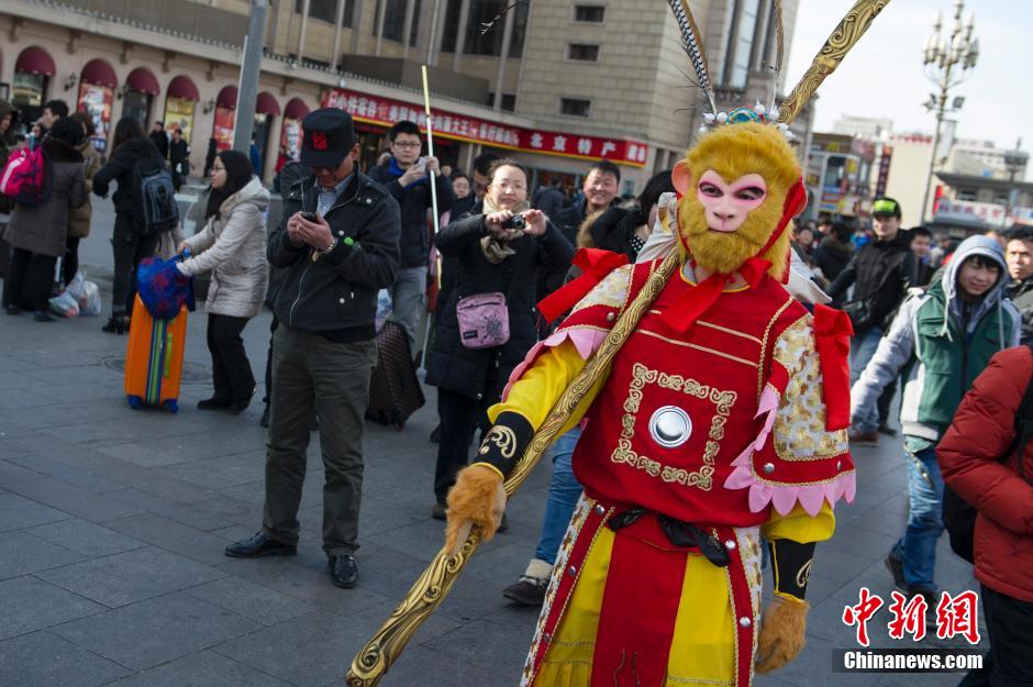 1月25日,孫悟空扮相的演員正在排隊(duì)買票。當(dāng)日,一名孫悟空扮相的旅客“快閃”現(xiàn)身北京站,引發(fā)周圍旅客和民眾圍觀。據(jù)了解,孫悟空的扮演者是一名來自北京電影學(xué)院的河南籍學(xué)生,由于自己很快也將成為2014春運(yùn)大軍中的一員,他表示希望用孫悟空勇敢機(jī)智的形象,以“快閃”的形式為旅途中的人們加油打氣,他同時也希望自己在新的一年里能有一番作為。中新社發(fā) 崔楠 攝