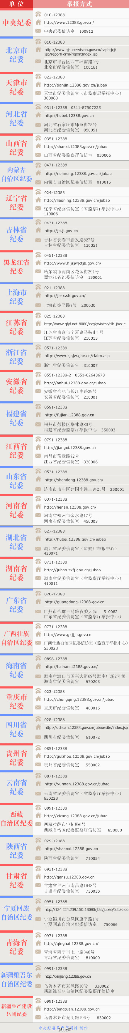 中央紀委、31省份及新疆生產(chǎn)建設(shè)兵團的舉報電話均已統(tǒng)一成12388,只是在區(qū)號上加以區(qū)分。中央紀委和北京市紀委共用010-12388一個舉報電話,新疆和新疆生產(chǎn)建設(shè)兵團則共用0991-12388;而河北和安徽在通用舉報電話之外,還額外設(shè)有舉報電話。