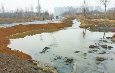 市民王先生反映,南水北調(diào)大橋南邊的祈福大道上,到處都是積水?,F(xiàn)在水深一米多,長度有近百米,連公交車都不能通過?!白蛱煜掠?,積水更深,啥車都過不去。我們在這里幫助推滅火的車,不知推了多少輛。”
