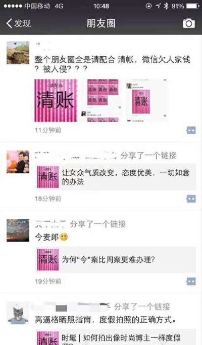 上午十點(diǎn)半左右,不少微信用戶反映其朋友圈被“請配合清帳”刷屏(如圖)。騰訊回應(yīng)稱:已確認(rèn)是由于少部分服務(wù)器上午升級導(dǎo)致短暫不穩(wěn)定,持續(xù)時(shí)間大約5分鐘?,F(xiàn)在已經(jīng)恢復(fù),主要受影響的是廣東聯(lián)通用戶。
