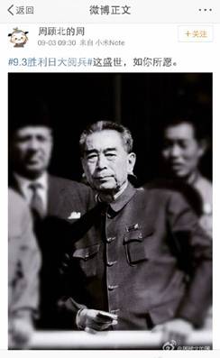 讓人難忘的細節(jié)不僅僅在閱兵場上。3日上午9時30分,習(xí)近平主席偕夫人彭麗媛正在天安門迎候各國嘉賓,閱兵尚未正式開始,會場內(nèi)外興奮期待的氛圍漸濃。就在此時,網(wǎng)友“周顧北的周”發(fā)布了一條微博“這盛世,如你所愿”,配圖是一張周恩來總理的老照片。短短的七字微博引發(fā)了網(wǎng)友的強烈共鳴,轉(zhuǎn)發(fā)已過百萬?!伴_國大典的時候飛機不夠,周總理說飛兩遍,現(xiàn)在再也不需要飛兩遍了,要多少有多少。山河猶在,國泰民安。當(dāng)年送你的十里長安街,如今已是十里繁榮。”