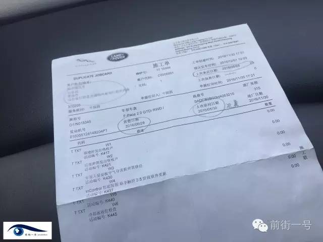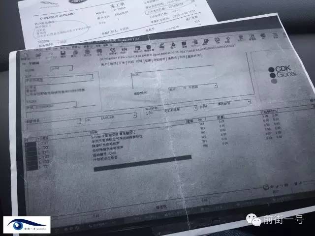 在客戶提供的“施工單”復印件上,前街一號記者看到上面記錄了陳先生的個人及所購車輛詳細信息。在“描述”一欄中,記者看到了包括“橫撐桿發(fā)生咯吱聲”、“后彈簧發(fā)出咯吱聲”、“車頂天窗面板空氣倒流板彈簧移位”等六條記錄,且每條記錄后均有以“K”打頭的活動編號。