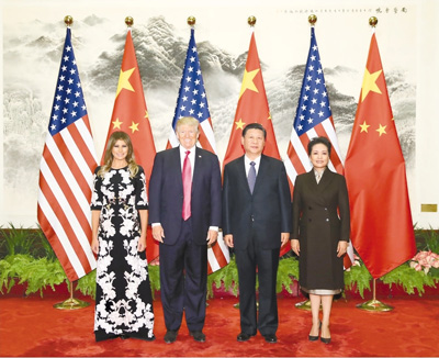 11月9日,國(guó)家主席習(xí)近平在北京人民大會(huì)堂東門(mén)外廣場(chǎng)舉行歡迎儀式,歡迎美利堅(jiān)合眾國(guó)總統(tǒng)唐納德·特朗普對(duì)中國(guó)進(jìn)行國(guó)事訪(fǎng)問(wèn)。這是習(xí)近平和夫人彭麗媛在人民大會(huì)堂同特朗普夫婦合影。