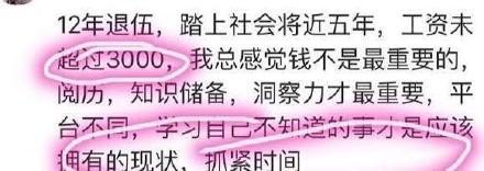 12年退伍,在社會上5年,工資未超過3000元,但是感覺錢不是最重要的,只是儲備,洞察力才重要,學習自己不知道是才是應該有的狀態(tài)。