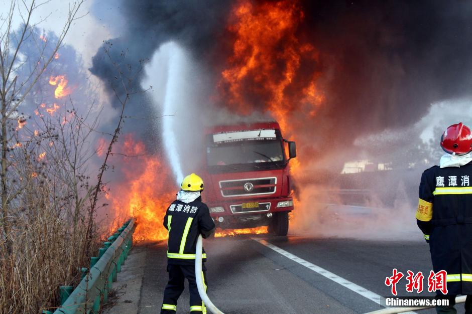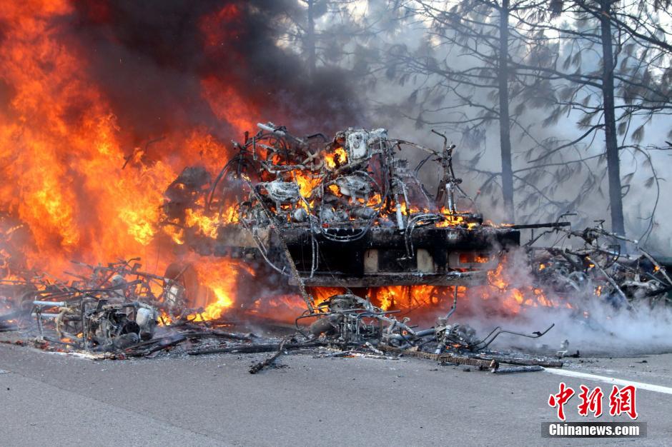 1月23日下午4時(shí)許,滬昆高速公路江西弋陽往貴溪方向593公樁(貴溪收費(fèi)站附近)一輛載有133部電動(dòng)車的半掛車起火,導(dǎo)致電動(dòng)車被大火“吞噬”。江西貴溪消防官兵接警后迅速到場撲救,半小時(shí)后將大火撲滅。據(jù)司機(jī)稱,火災(zāi)疑因高速護(hù)坡雜草叢起火產(chǎn)生的火芯飄至半掛車,引燃包裝電動(dòng)車的紙殼箱所致。中新社發(fā) 龔武 攝