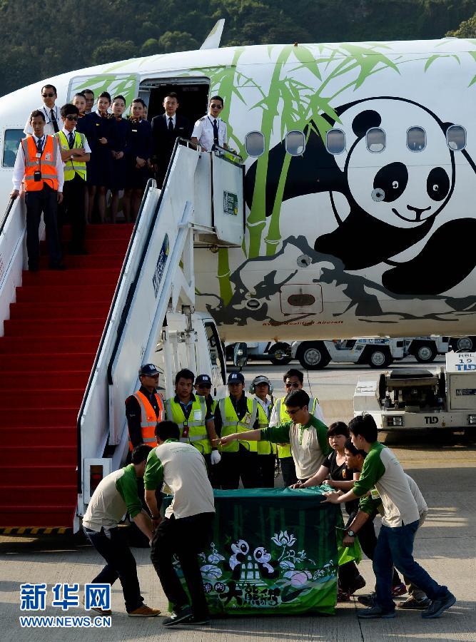 4月30日,大熊貓抵達(dá)澳門機(jī)場。當(dāng)日16時(shí)許,中央政府贈(zèng)送澳門的新一對(duì)大熊貓運(yùn)抵澳門,澳門特區(qū)政府行政法務(wù)司司長陳海帆等官員及部分少年兒童在機(jī)場迎接。大熊貓經(jīng)檢疫人員檢查后在運(yùn)輸籠中向前來接機(jī)的人們短暫亮相。目前它們身體狀況良好,隨后將前往金像農(nóng)場進(jìn)行30天隔離檢疫。新華社記者張金加攝