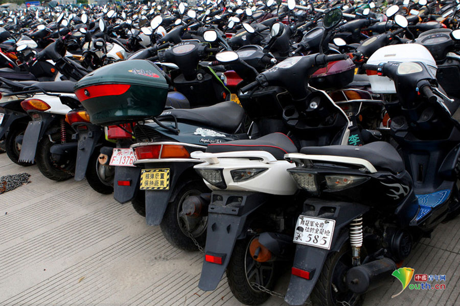 2015年6月4日,超寬、超速、非法營運三輪電摩及各種摩托車密密麻麻重重疊疊地堆積在一起,從高空中俯瞰場面震撼。這不只是杭州一家報廢車停車場的情景,幾乎每家停車場都如此。工作人員說,這都是交警執(zhí)法過程中收繳的。工作人員跟記者抱怨說,電摩停放時間太長,再不拆解都停不下了!據(jù)負責人介紹,杭州自禁摩托車以來,總有一些違規(guī)者偷偷地利用摩托車充當黑摩的。此舉既不安全,也暗藏各種不安全因素。2014年,杭州有204人死于涉及電瓶車的交通事故;在所有交通事故中,涉及電瓶車的占到四成以上。3月25日,有杭州媒體報道,杭州收繳的電動車已堆滿停車場,據(jù)估算馬路上還有百萬輛以上超標車。(金童子/攝)