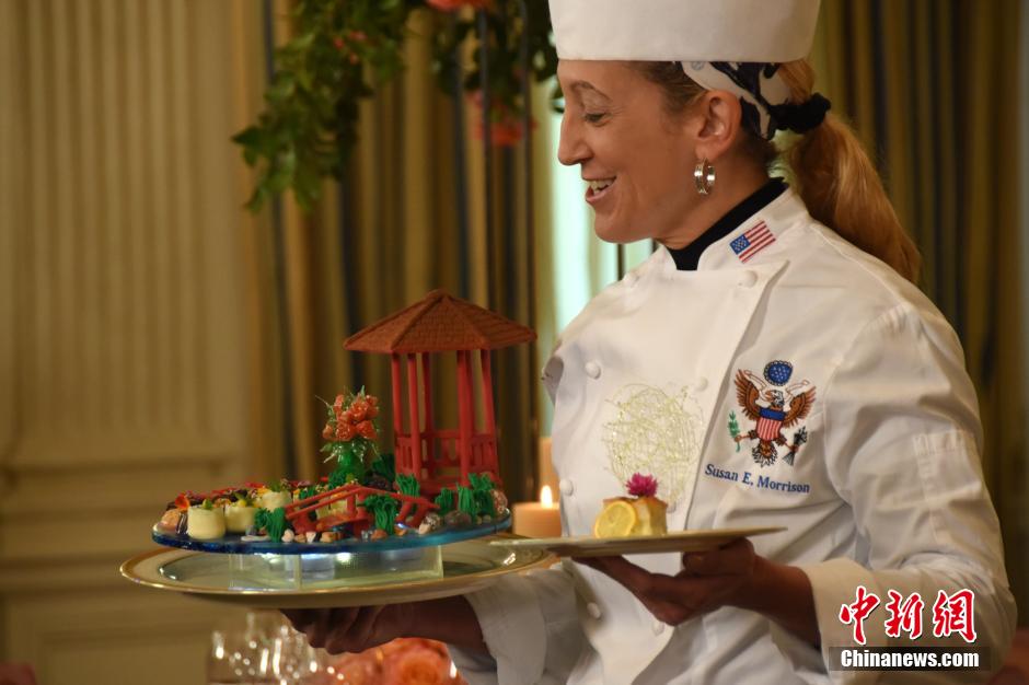 白宮首席甜點(diǎn)師莫里森展示為此次國(guó)宴準(zhǔn)備的甜點(diǎn)。 中新社記者 刁海洋攝
