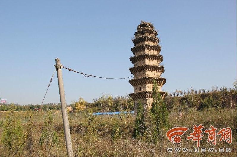 華商報(bào)記者注意到,該塔為六面九級磚木結(jié)構(gòu)實(shí)心塔,高約20米。從塔下方觀察,塔基座上有部分磚頭剝落,塔體向西北方向有傾斜,但并不是很嚴(yán)重。在塔身的第四層系有一根比大拇指略粗的鋼索,另一頭系在十米開外的一根水泥電線桿上。而在塔的正北方,還有人圈了一片地,蓋了棟活動板房養(yǎng)了數(shù)百只雞,但記者并未找到養(yǎng)雞場的主人。