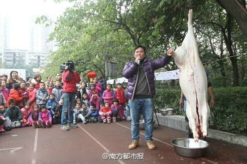 12月24日下午,重慶玉帶山小學舉行“民俗文化代代傳 傳統(tǒng)文化進校園”活動。學校從鄉(xiāng)下買回兩頭年豬,請來村民講述年豬習俗,殺豬匠殺豬后,科學老師為學生講解年豬身體結構。