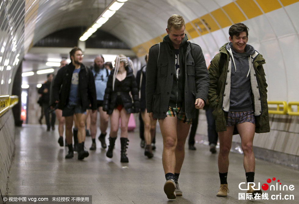 當(dāng)?shù)貢r(shí)間2016年1月10日,捷克布拉格,“地鐵無(wú)褲日”當(dāng)天,乘客穿短褲乘車。圖片來(lái)源:視覺中國(guó)