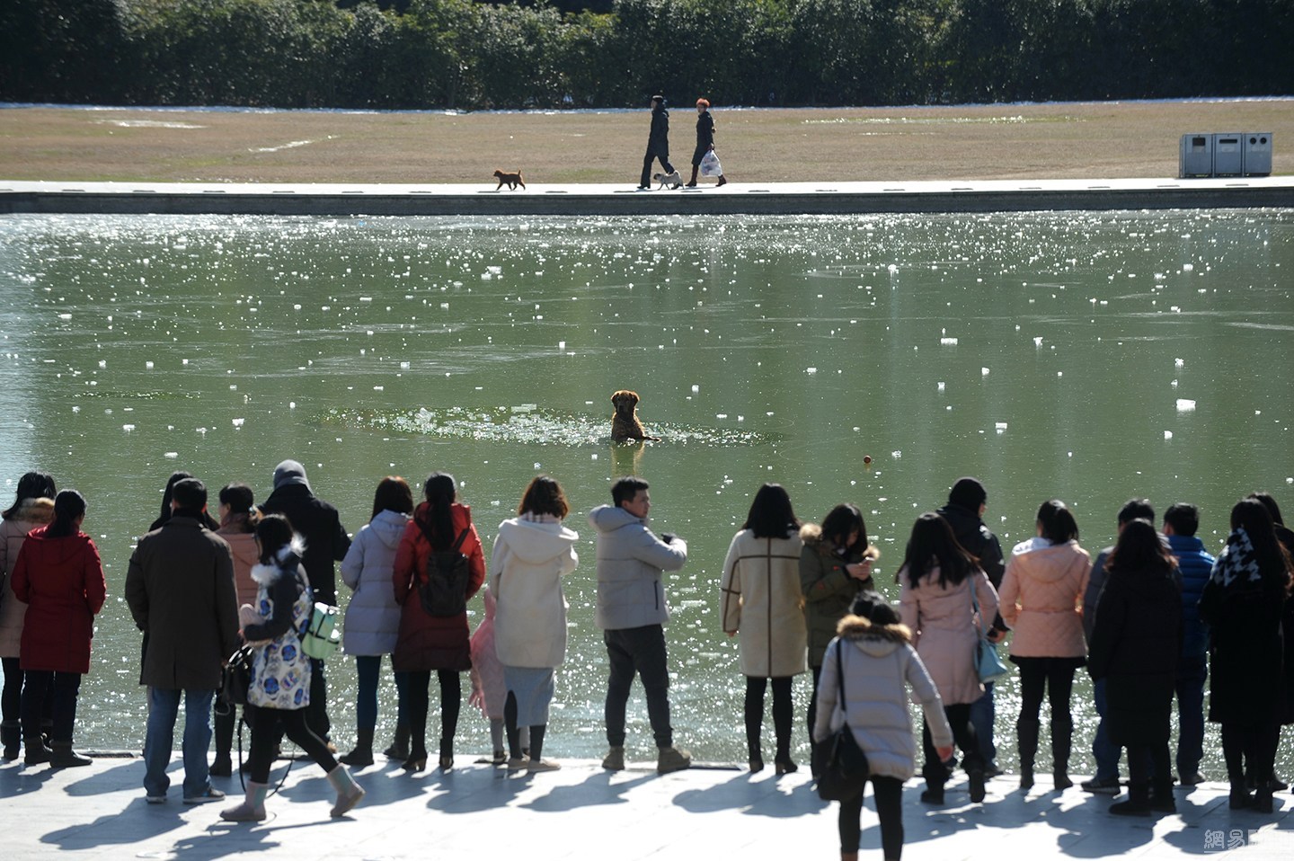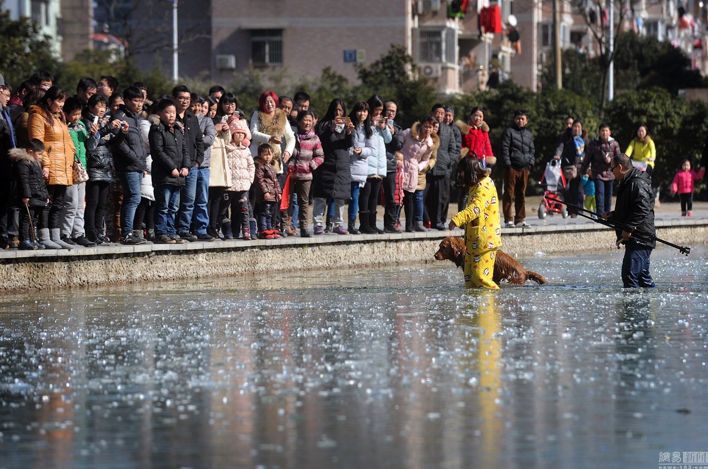 “我知道這水不深,自己又會(huì)游泳。”面對冰冷的水面,項(xiàng)先生并沒有多想,只想趕緊救出狗狗。圖為兩人合力救金毛現(xiàn)場。