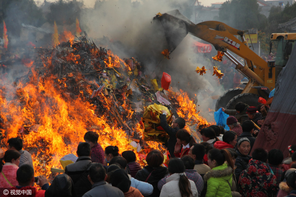 2016年3月10日,農(nóng)歷二月初二,在河南省淮陽縣舉辦的太昊陵古廟會上,大批香客涌入進(jìn)香。盡管相關(guān)部門已貼出公告,要求愛護(hù)環(huán)境,禁燒高香。但仍有許多群眾燃香長度和直徑也明顯超出規(guī)定,燃燒的祭品堆成小山。供圖:視覺中國
