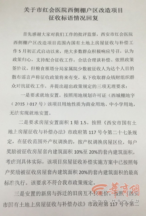 西安市紅會醫(yī)院西側(cè)棚戶區(qū)改造項目房屋征收補償工作指揮部對此事的回復
