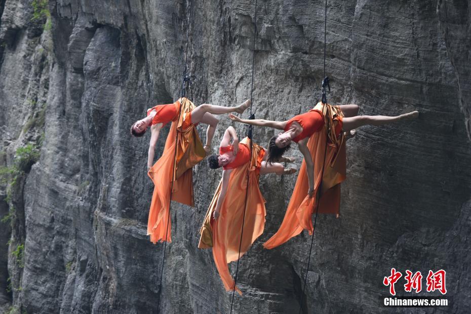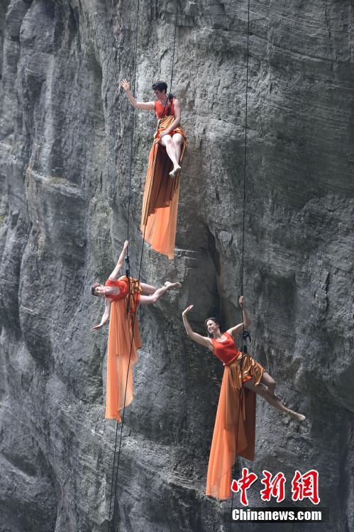 9月13日,美國BANDALOOP高空舞蹈團在湖南張家界天門山的懸崖絕壁間盡情展現“垂直舞蹈”的藝術與魅力,其優(yōu)雅而驚險的舞姿與鬼斧神工般的自然奇景融合、互動,吸引了不少游客駐足欣賞。中新社發(fā) 向韜 攝