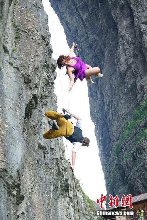 9月13日,美國BANDALOOP高空舞蹈團在湖南張家界天門山的懸崖絕壁間盡情展現“垂直舞蹈”的藝術與魅力,其優(yōu)雅而驚險的舞姿與鬼斧神工般的自然奇景融合、互動,吸引了不少游客駐足欣賞。中新社發(fā) Basil tsimoyanis 攝