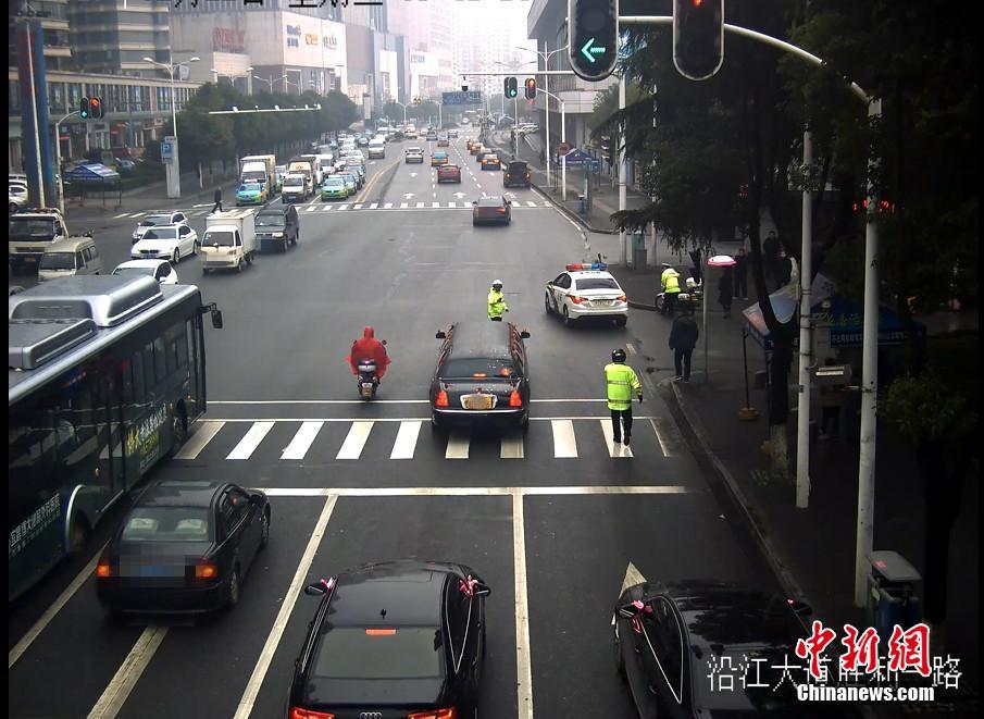 2月22日,湖北宜昌一位新郎在迎親時,迎親車隊的頭車因涉嫌套牌被交警查獲。在新郎家屬和交警溝通后,當(dāng)?shù)亟痪诵曰瘓?zhí)法,先“開道護(hù)送”,迎親結(jié)束后才扣下套牌車。圖為交警將套牌婚車成功攔截。石寧 攝