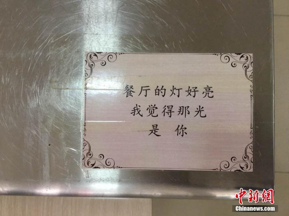 “這些情詩是開學(xué)前貼上的,剛開始只是想讓餐廳更個(gè)性化一點(diǎn)?!钡聦氹拚f,很多人覺得食堂就是個(gè)做大鍋菜的地方,吃飽肚子就行?!拔蚁爰右稽c(diǎn)不一樣的元素,就發(fā)動(dòng)朋友收集和吃飯有關(guān)的三行情書?!毖辔?阿琳娜 攝影報(bào)道