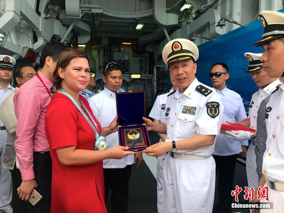 中國海軍艦艇編隊(duì)指揮員沈浩少將向登艦參觀的達(dá)沃市長薩拉·杜特爾特女士贈送紀(jì)念品。 中新社記者 張明 攝