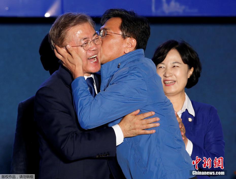 當(dāng)?shù)貢r(shí)間5月9日深夜,韓國(guó)第19屆總統(tǒng)選舉共同民主黨候選人文在寅及其競(jìng)選團(tuán)隊(duì)現(xiàn)身首爾光化門(mén)廣場(chǎng),發(fā)表“勝選演說(shuō)”,與支持民眾握手慶祝。據(jù)出口民調(diào)顯示,文在寅在當(dāng)日進(jìn)行的大選投票中以41.4%的支持率絕對(duì)優(yōu)勢(shì)勝選。在選舉管理委員會(huì)公布的大部分開(kāi)票結(jié)果中,文在寅得票率也遙遙領(lǐng)先,提前鎖定勝局。 中新社記者 吳旭 攝