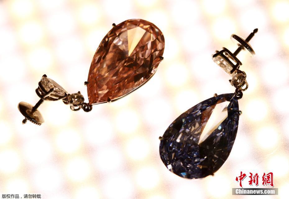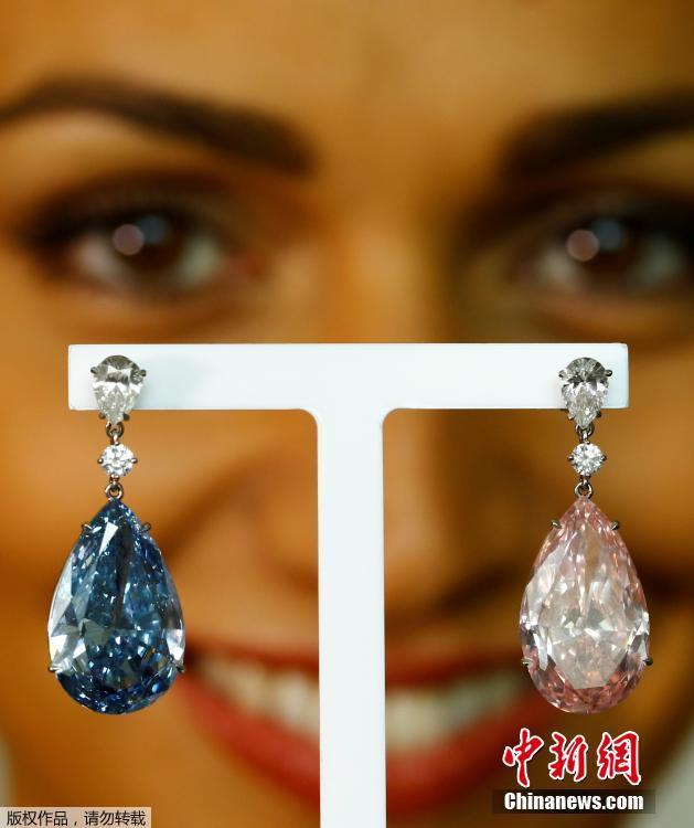 當(dāng)?shù)貢r(shí)間2017年5月11日,瑞士日內(nèi)瓦,14.54克拉的“阿波羅藍(lán)”和16克拉的“阿耳特彌斯粉”鉆石耳環(huán)即將在蘇富比拍賣行拍賣,估價(jià)分別為3800-5000萬美元和1250-1800萬美元。