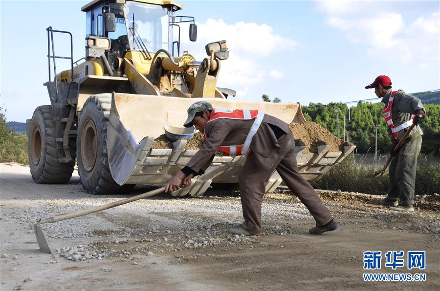 工人在云南省會(huì)澤縣駕車鄉(xiāng)的鄉(xiāng)村公路施工現(xiàn)場(chǎng)忙碌(10月20日攝)。