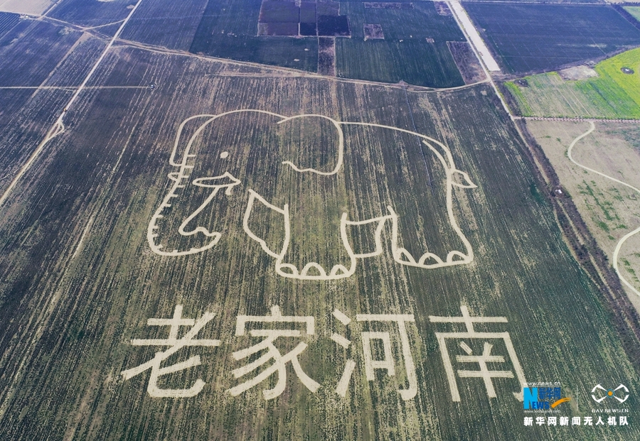 近日,《老家河南》創(chuàng)意圖案亮相河南省溫縣境內(nèi)的黃河濕地。據(jù)介紹,這幅圖案占地一公頃,主要通過圖案設(shè)計(jì)、定點(diǎn)測繪、錯(cuò)季間作、田間管理等環(huán)節(jié)制作而成,《老家河南》由大象圖案和“老家河南”字樣組成。新華網(wǎng)發(fā) 徐宏星攝