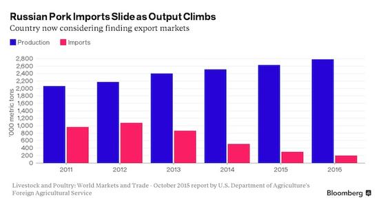 據(jù)彭博社報(bào)道,美國(guó)農(nóng)業(yè)部數(shù)據(jù)顯示,俄羅斯國(guó)內(nèi)豬肉產(chǎn)量四年里增加了26%,創(chuàng)下了歷史最高水平;與此同時(shí),進(jìn)口從2012年的峰值下降了超過80%。