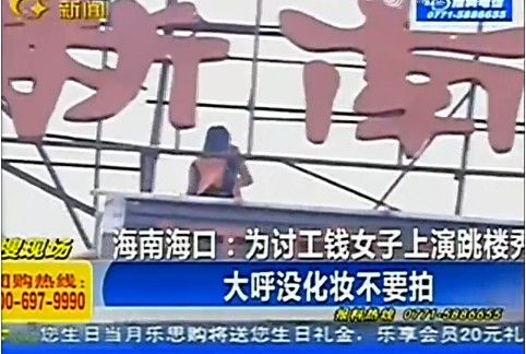 法制晚報:【女子跳樓見記者拍攝:“我沒化妝不要拍”】近日,??谝幻訛橛懝ゅX上演跳樓秀。她坐在大樓樓頂?shù)膹V告牌前,用手抓住廣告牌鐵架,神情激動。警方和救護(hù)人員做好準(zhǔn)備隨時出動救援。見到記者拍攝,女子大喊:不要拍了!我今天沒有化妝,不夠漂亮,很難看!