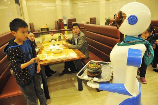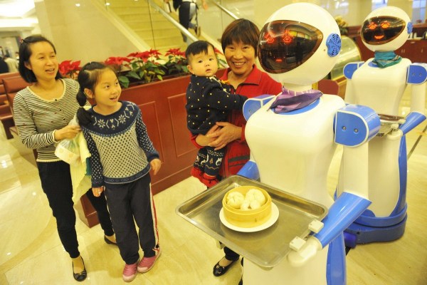 11月24日,浙江寧波聯(lián)盛廣場的一家港式餐廳推出了機器人送餐服務,"她們"端著顧客點的食物,在餐廳里滑行前進,到點餐的餐桌,會自動停下來,用普通話向顧客播報“您點的餐,請慢用”。新奇的創(chuàng)意吸引了許多市民前來體驗。郭小鎧/CFP