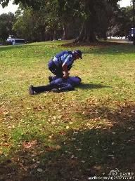 一名目擊導(dǎo)游說:“剛才有兩個客人在悉尼草坪上方便,讓警察看見了。警察追他們,他們提著褲子跑。他們惱羞成怒,要打警察。警察一個過肩摔,把一個男的摔地上骨折了?,F(xiàn)在救護車,警車都過來了。”