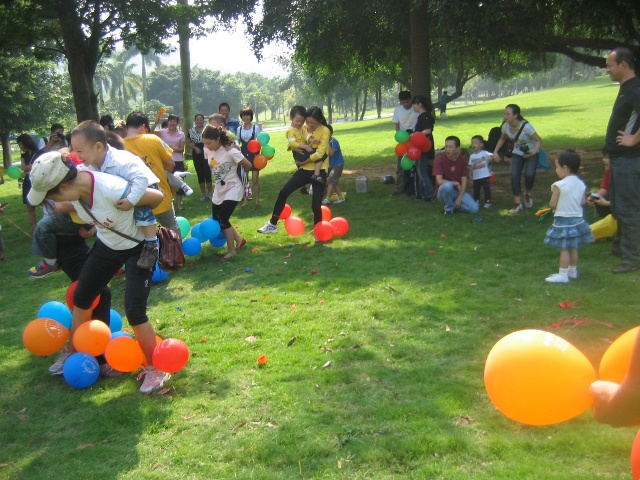 游戲規(guī)則:每個(gè)家庭由一名家長和一名孩子參加,由工作人員給參與的每個(gè)家庭發(fā)三個(gè)氣球和一根細(xì)繩,請家長將氣球吹大綁在自己的腳腕,身背孩子。聽到主持人的口令游戲開始,家長就背著寶寶踩其他家庭的氣球,在互相踩氣球的同時(shí),首先要注意安全,其次要保護(hù)自己的氣球,還要將別的家庭的氣球踩破,氣球被踩爆即被淘汰,比一比誰是冠軍。