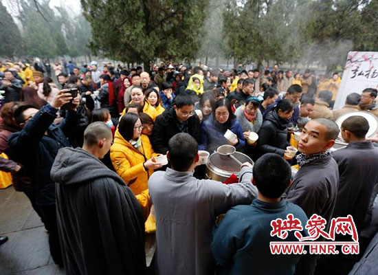 2017年1月5日在河南省登封少林寺,少林寺臘八施粥并舉行祈福法會,吸引數(shù)千名群眾前來喝粥。昨天是傳統(tǒng)的“臘八節(jié)”,隨著這一天的到來,年味漸濃,整個舊歷年年俗隨之拉開帷幕。