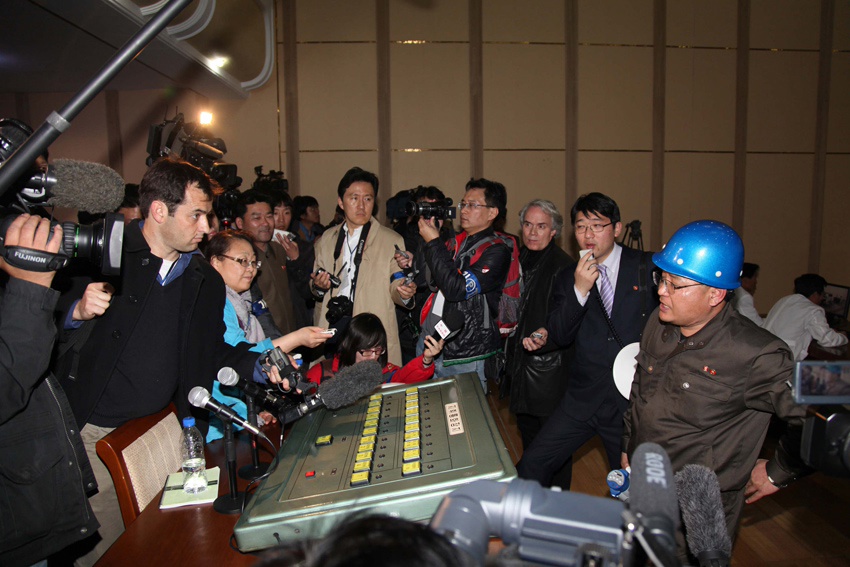 2012年4月8日,在朝鮮平安北道鐵山郡東昌里的“西海衛(wèi)星發(fā)射場”監(jiān)控中心,“西海衛(wèi)星發(fā)射場”總負責(zé)人張明進(戴藍盔者)向記者介紹情況。