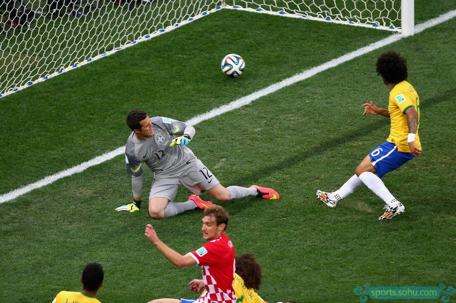 北京時(shí)間6月13日凌晨4時(shí),2014年巴西世界杯揭幕戰(zhàn)在圣保羅競(jìng)技場(chǎng)(科林蒂安競(jìng)技場(chǎng)、伊塔蓋拉球場(chǎng))展開,東道主巴西3-1逆轉(zhuǎn)東歐勁旅克羅地亞。第10分鐘,奧利奇左路傳中,馬塞洛不慎自擺烏龍。第29分鐘,內(nèi)馬爾依靠個(gè)人能力扳平比分。第69分鐘,弗雷德制造爭(zhēng)議點(diǎn)球,內(nèi)馬爾將球冷靜罰入,反超比分。第91分鐘,奧斯卡反擊中捅射再下一城。圖為馬塞洛烏龍進(jìn)球瞬間。