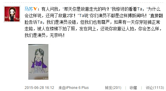 前天(6月26日),演員馬蘇參加某代言活動,下樓梯時被媒體拍到,稱其“疑似走光露臀部”。6月28日下午,馬蘇在微博公開回應此事,稱“演員也有尊嚴”。
