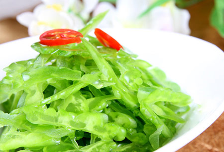 苦瓜可炒食、煮食或蒸食,清苦爽口,先苦后甜,口味長久。如將苦瓜和辣椒同炒,可減輕苦味。將其切成薄片,然后在上面灑上一些鹽漬。一會兒,再用水把鹽濾掉;也可以把苦瓜切成塊,然后煮熟,放進(jìn)冷水中浸泡,這樣苦瓜的苦味就會減少許多。