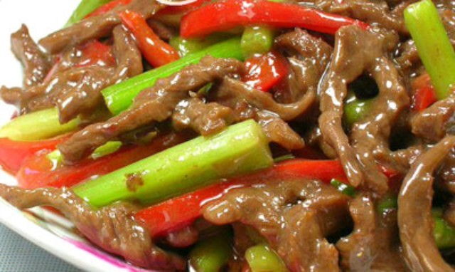 4.鍋內(nèi)留少許油復上火,放入蔥姜片爆炒,放入芹菜塊,一分鐘左右放入牛肉同炒,放入鹽,糖加水中小火5-10分鐘左右,加味精,最后淀粉勾兌起鍋。