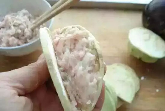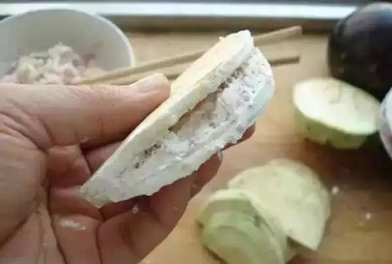 3. 茄子去皮切成連刀片,要切的薄一點(diǎn),便于成熟,抹少許面粉。